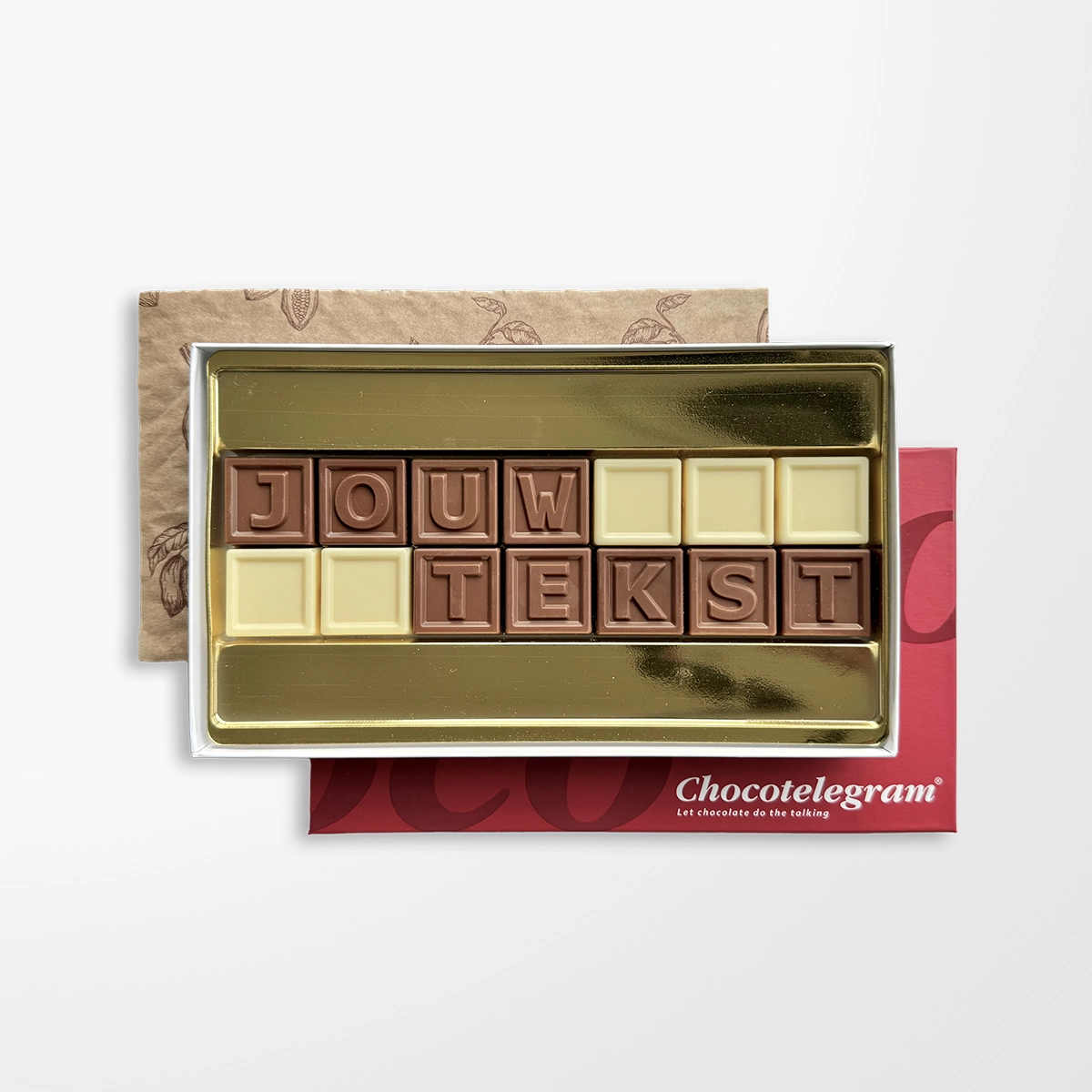 Met Chocotelegram zeg je het op de lekkerste manier! Stel je eigen boodschap samen waarbij elk karakter bestaat uit een heerlijk chocoladeblokje. Of het nu gaat om een felicitatie, lief bericht, grappige quote of originele uitnodiging, jouw tekst wordt letterlijk omgetoverd tot chocolade.