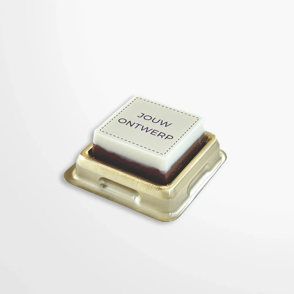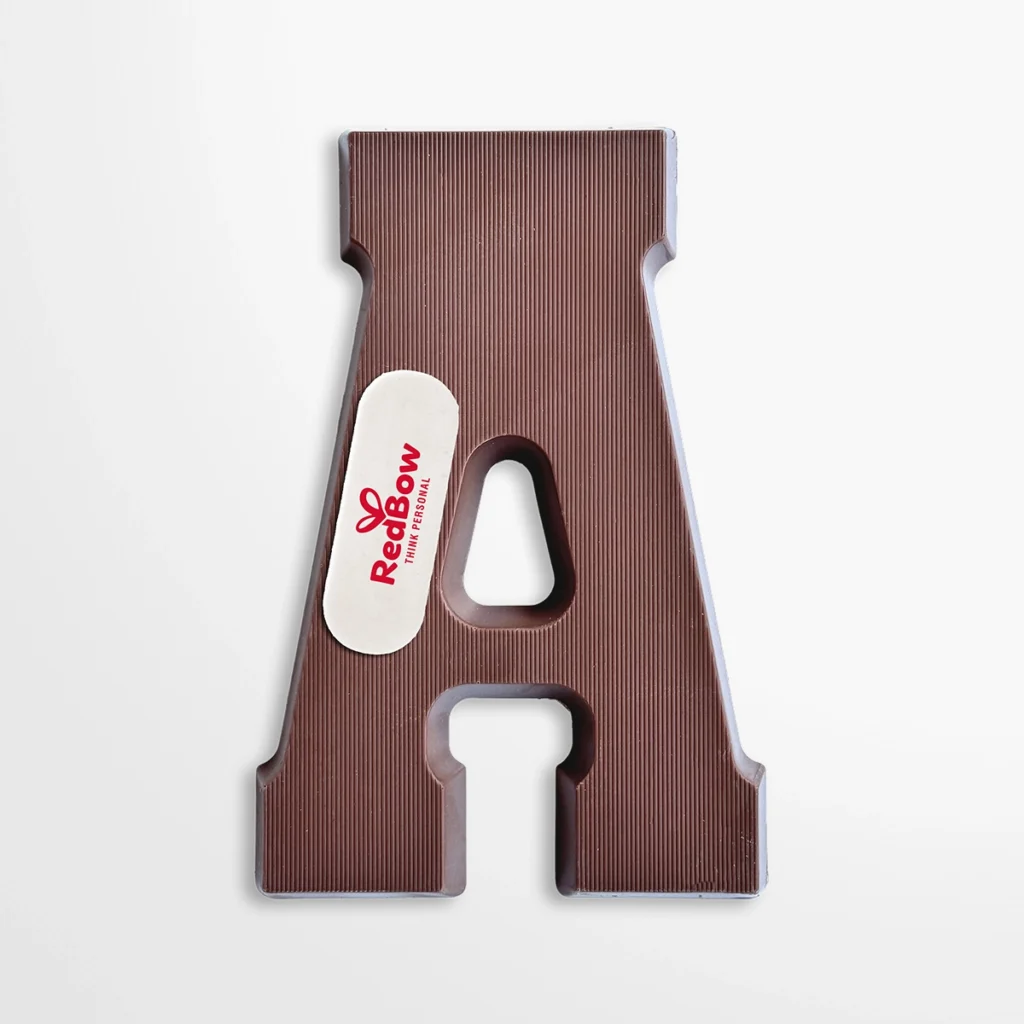 Een exclusieve chocoladeletter met jouw huisstijl, foto of tekst, opgebouwd uit 3 delen: melk, wit en puur.